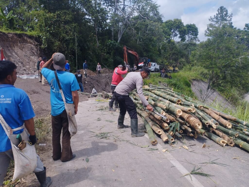 Ia menambahkan bahwa pemasangan bambu penahan tanah dilakukan sebagai solusi darurat sambil menunggu penanganan lanjutan dari instansi terkait. “Upaya ini memang bersifat sementara, kami berharap risiko longsor dapat diminimalkan dan jalan tetap aman dilalui,” tambahnya.