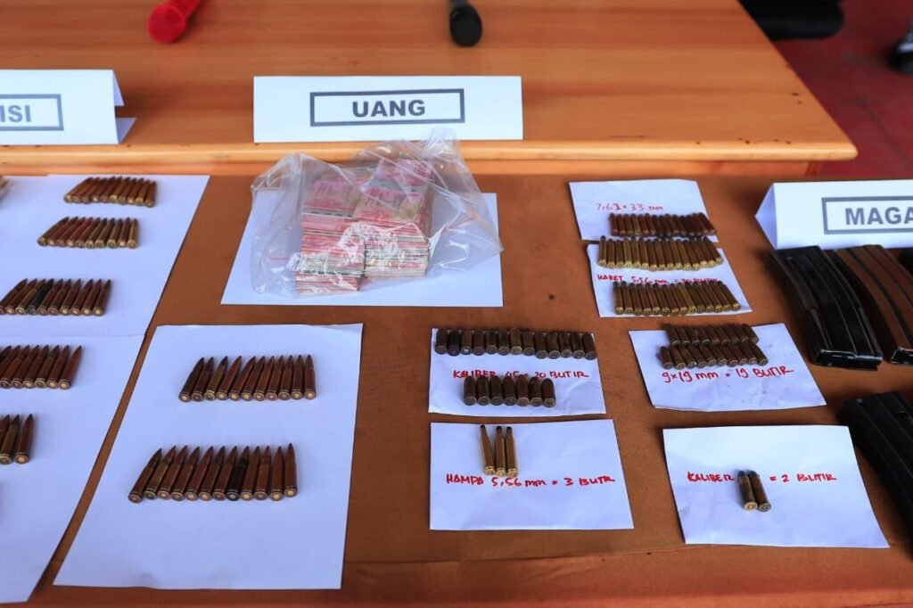 Dari hasil operasi tersebut, aparat mengamankan sejumlah barang bukti yang diduga berkaitan dengan aktivitas kelompok bersenjata, antara lain 561 butir amunisi berbagai kaliber, 10 buah magazen, 12 unit telepon genggam, 5 unit alat komunikasi, uang tunai puluhan juta rupiah, bendera dan perlengkapan lainnya, serta tiga tas berisi perlengkapan kelompok.