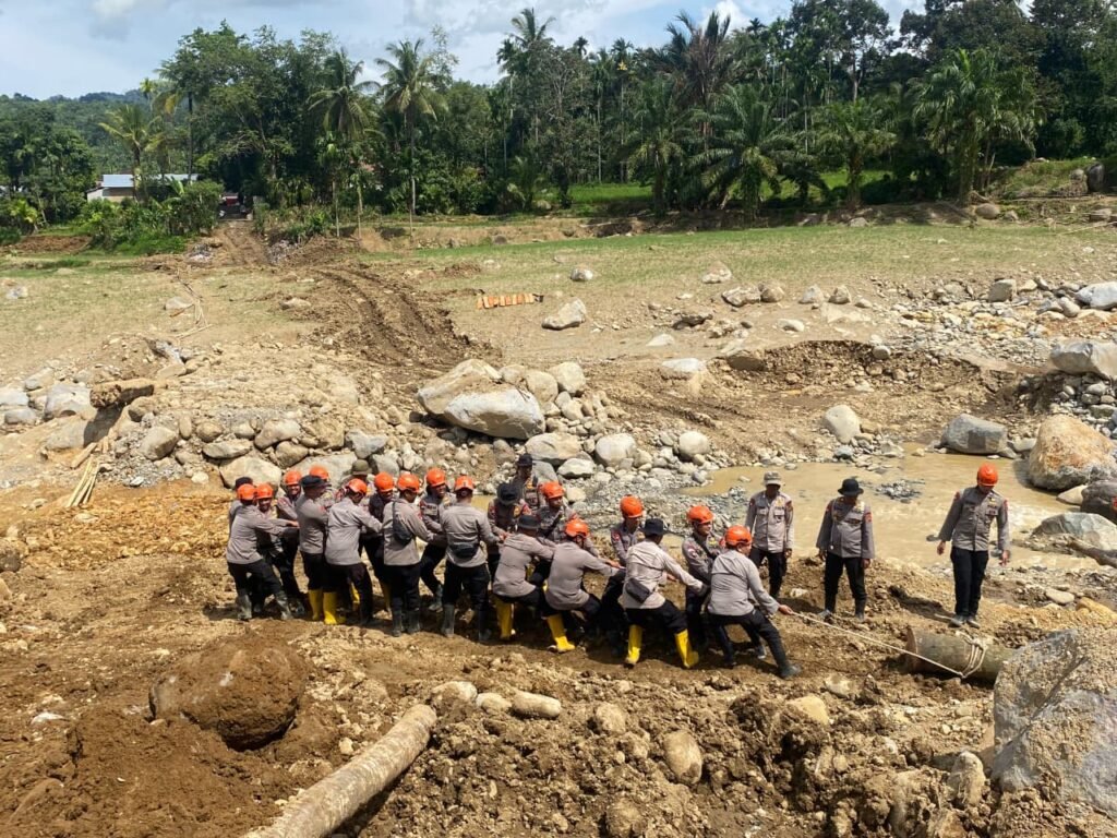 Dalam kegiatan tersebut, personel Brimob bergotong royong mengangkut kayu serta material dasar untuk membangun jembatan darurat. Jembatan ini sangat dibutuhkan masyarakat setempat karena menjadi akses utama penghubung antar desa yang sempat terputus akibat bencana.