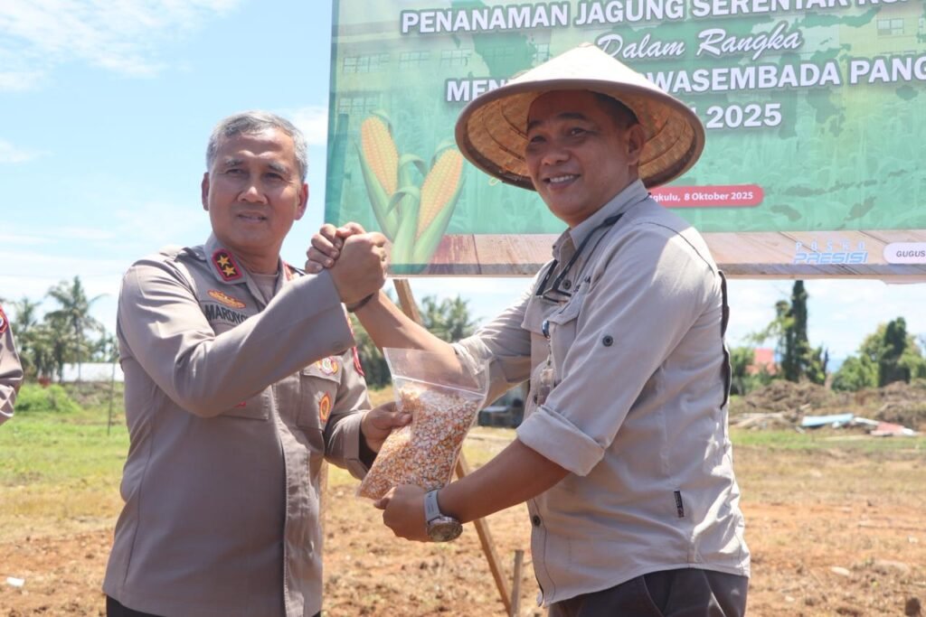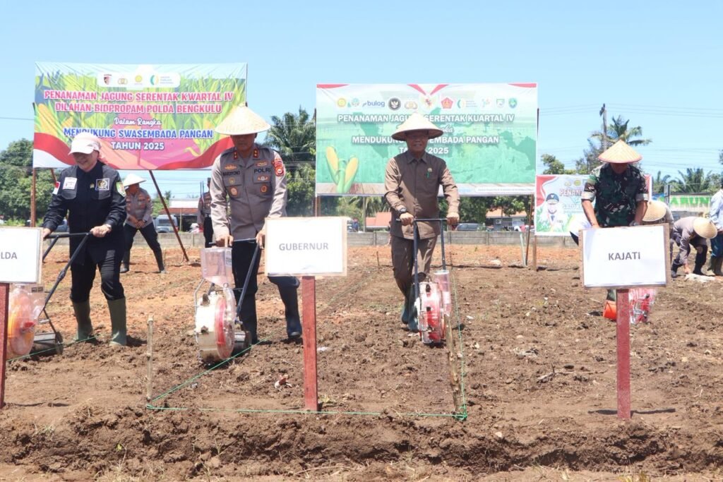 TBnews, Bengkulu – Kapolda Bengkulu Irjen Pol. Mardiyono, S.I.K., M.Si. membuka kegiatan Penanaman Jagung Serentak Kwartal Tahap IV dalam rangka mendukung program swasembada pangan nasional tahun 2025 yang digelar di kawasan SDN 75 Kampung Melayu, Kota Bengkulu, Rabu (08/10/2025). Kegiatan ini merupakan wujud nyata sinergi antara TNI, Polri, pemerintah daerah, dan berbagai lembaga dalam memperkuat ketahanan pangan di Provinsi Bengkulu.