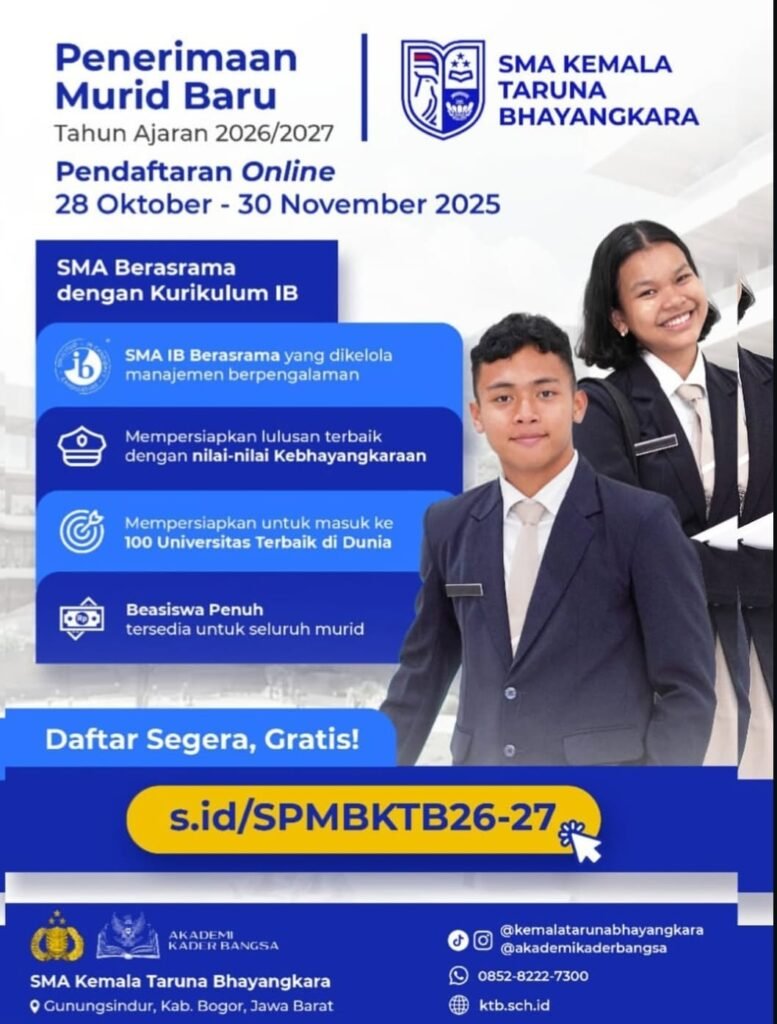 SMA Kemala Taruna Bhayangkara berlokasi di Gunungsindur, Kabupaten Bogor, Jawa Barat, di bawah naungan Akademi Kader Bangsa. Calon orang tua dan siswa dapat memperoleh informasi lebih lanjut melalui media sosial resmi sekolah @kemalatarunabhayangkara dan @akademikaderbangsa atau menghubungi nomor 0852-8222-7300. Dengan fasilitas berstandar tinggi, kurikulum internasional, serta jaminan beasiswa penuh, SMA Kemala Taruna Bhayangkara berkomitmen mencetak generasi muda Indonesia yang siap menjadi pemimpin masa depan. Calon siswa diimbau segera mendaftar sebelum batas waktu pendaftaran berakhir.